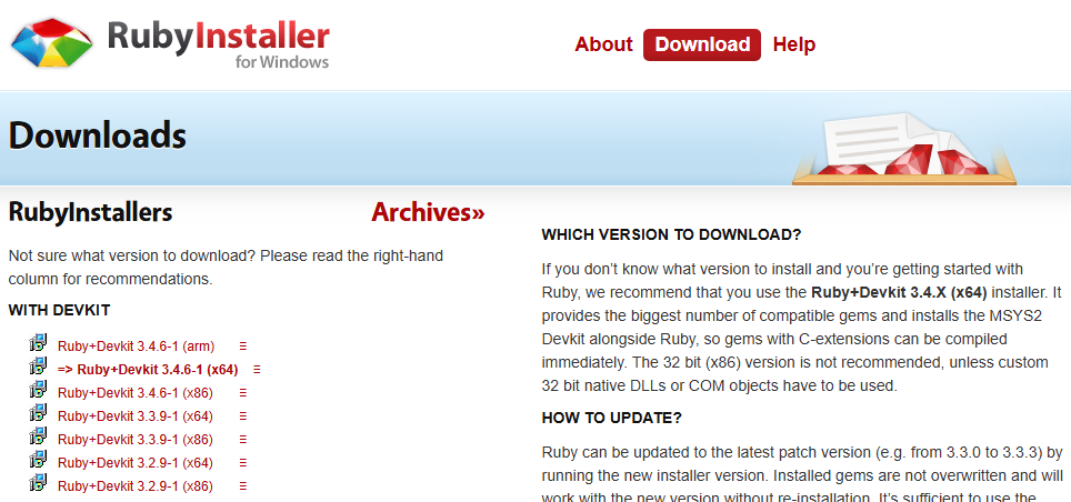 Jekyll은 Ruby로 작성된 정적 사이트 생성기이므로, 먼저 Ruby를 설치해야 한다. https://rubyinstaller.org/downloads/ 에서 최신 버전의 Ruby Installer를 다운로드하고 설치한다. WITH DEVKIT 버전을 설치한다.